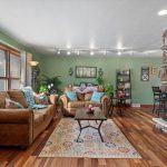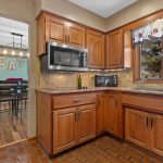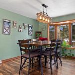 Main level features a large living/dining room with a corner gas fireplace, resting on a Brazilian Pecan Hardwood floor. Beautiful eat in Kitchen.