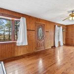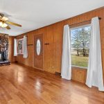 Hardwood Floors in Living Room with knotty pine walls and Natural Fieldstone Fireplace.