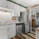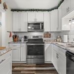 Attractive plank flooring, white kitchen cabinets, stainless steel refrigerator, range, dishwasher.